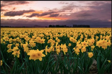 Sunrise on an early spring morning, more golden than orange today - perhaps to match the abundant daffodils happily littering the landscape. Accompanied by a chorus of birds who without knowing the why, know what to do - it’s just in them. Birds sing-in the morning.